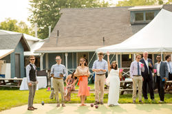 Casual and fun, Kayla & Leo hosted their wedding on Ward's Island, with the breathtaking Toronto skyline as their ceremony backdrop. Invoking their inner hipsters, guests sat on mats and benches for the ceremony before kicking their shoes off for cocktails and lawn bowling. A dinner of burgers and corn on the cob was served picnic BBQ style on eco-friendly plateware. The vivacious Sidewalk Crusaders played under the stars, and guests were treated to a delicous array of homestyle donuts.